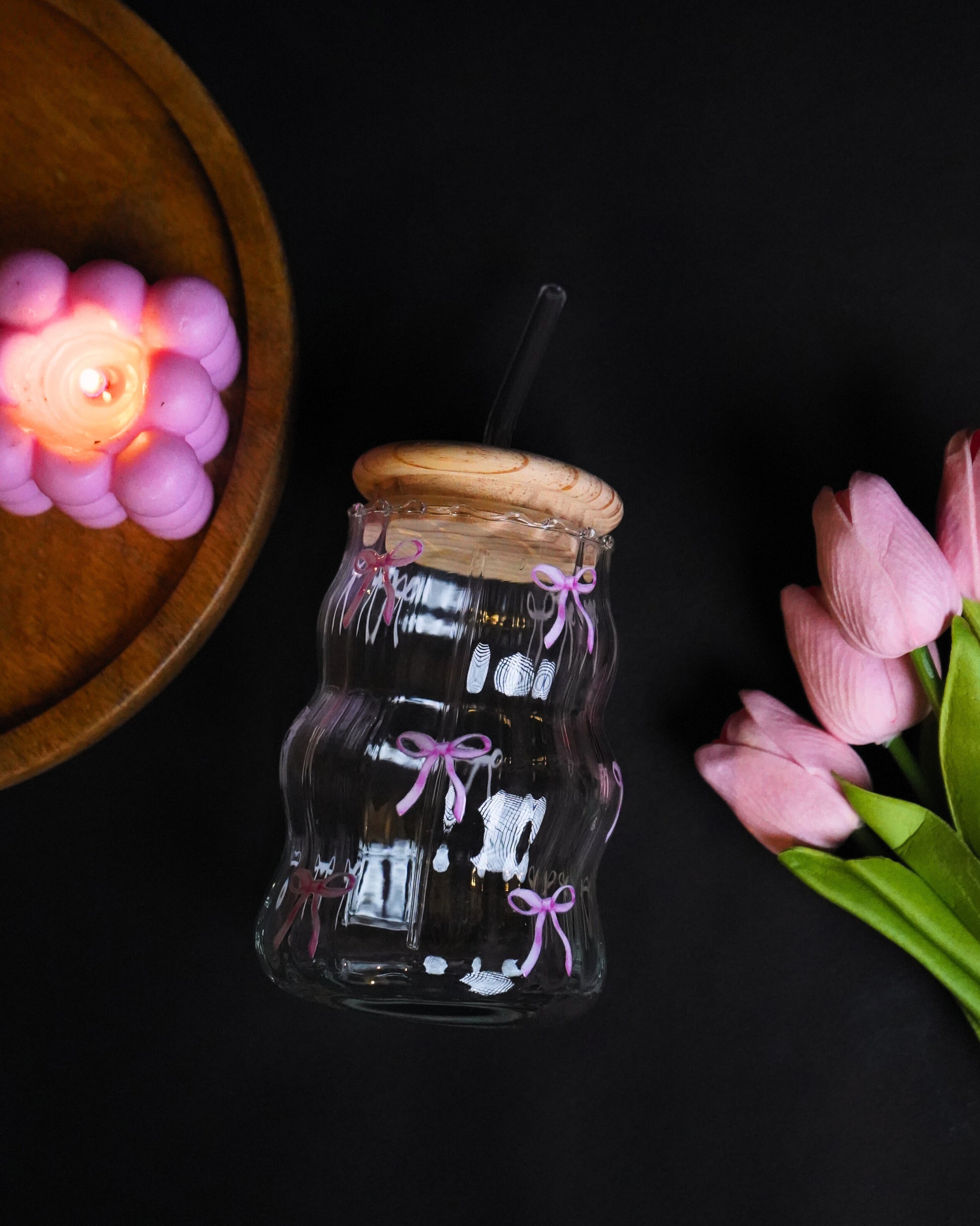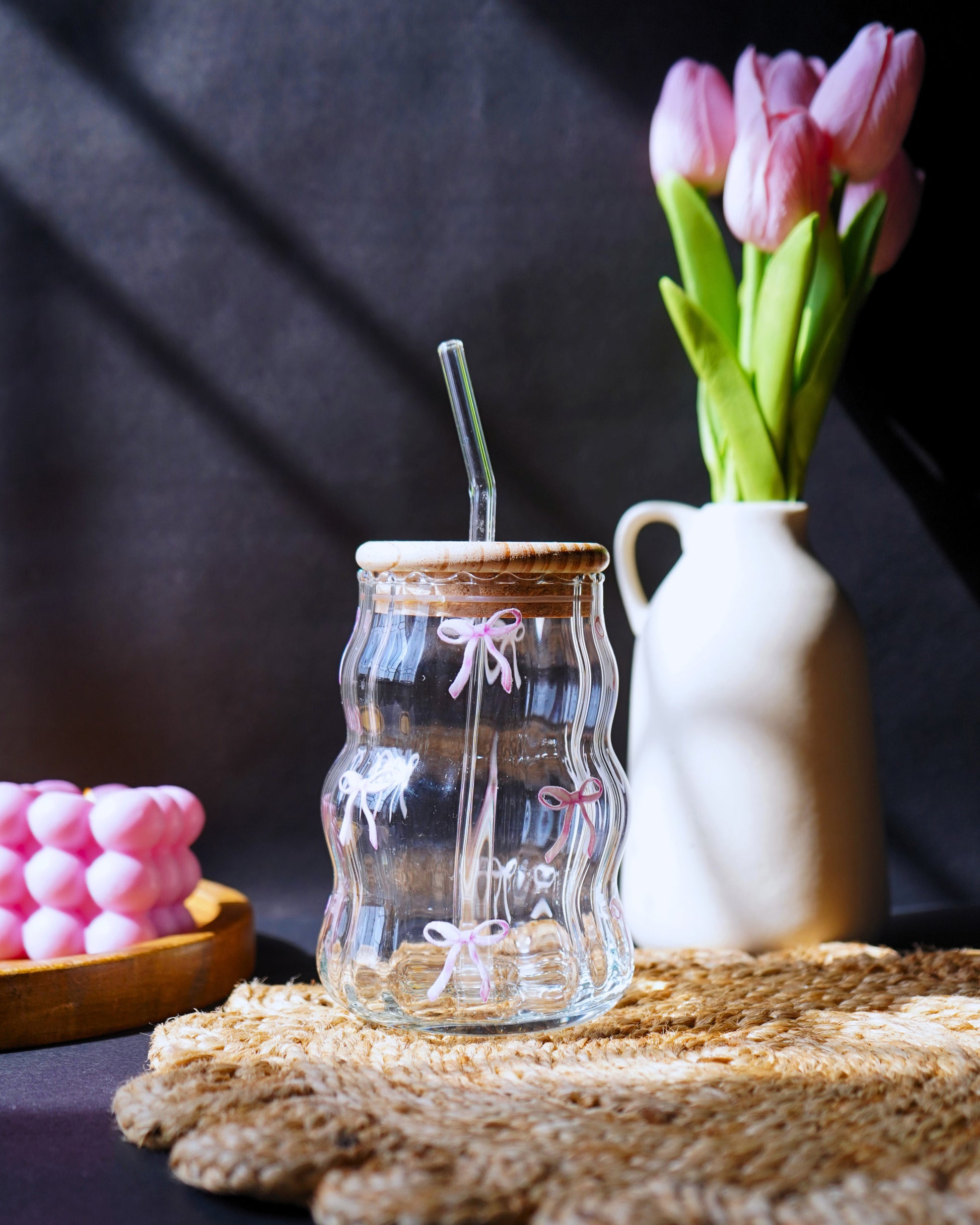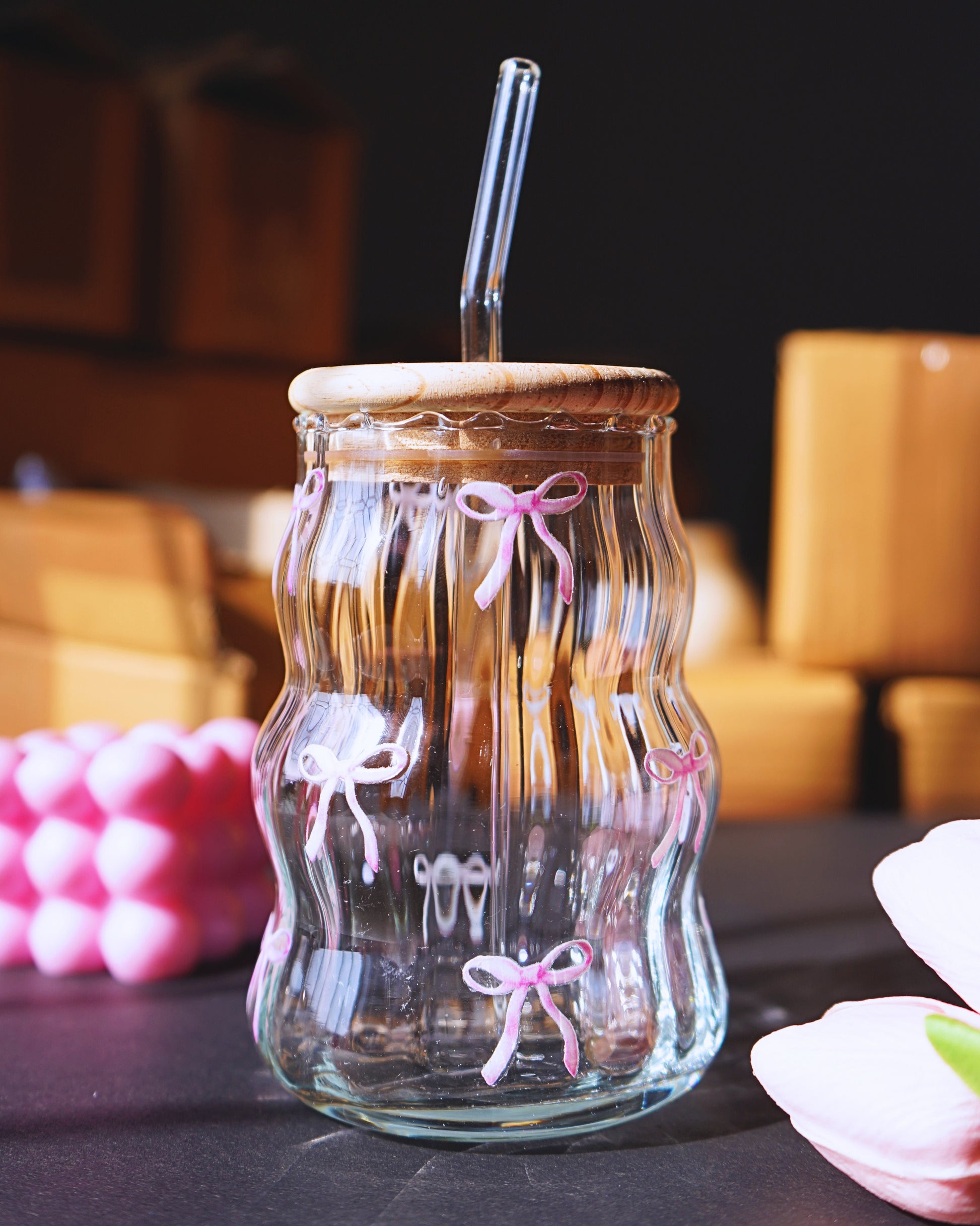 Meet Blushie — your new fav glass tumbler that’s equal parts soft girl charm and subtle slay. featuring dainty pink bows on clear glass, she’s giving picnic dates, love letters, and main character energy with every sip.