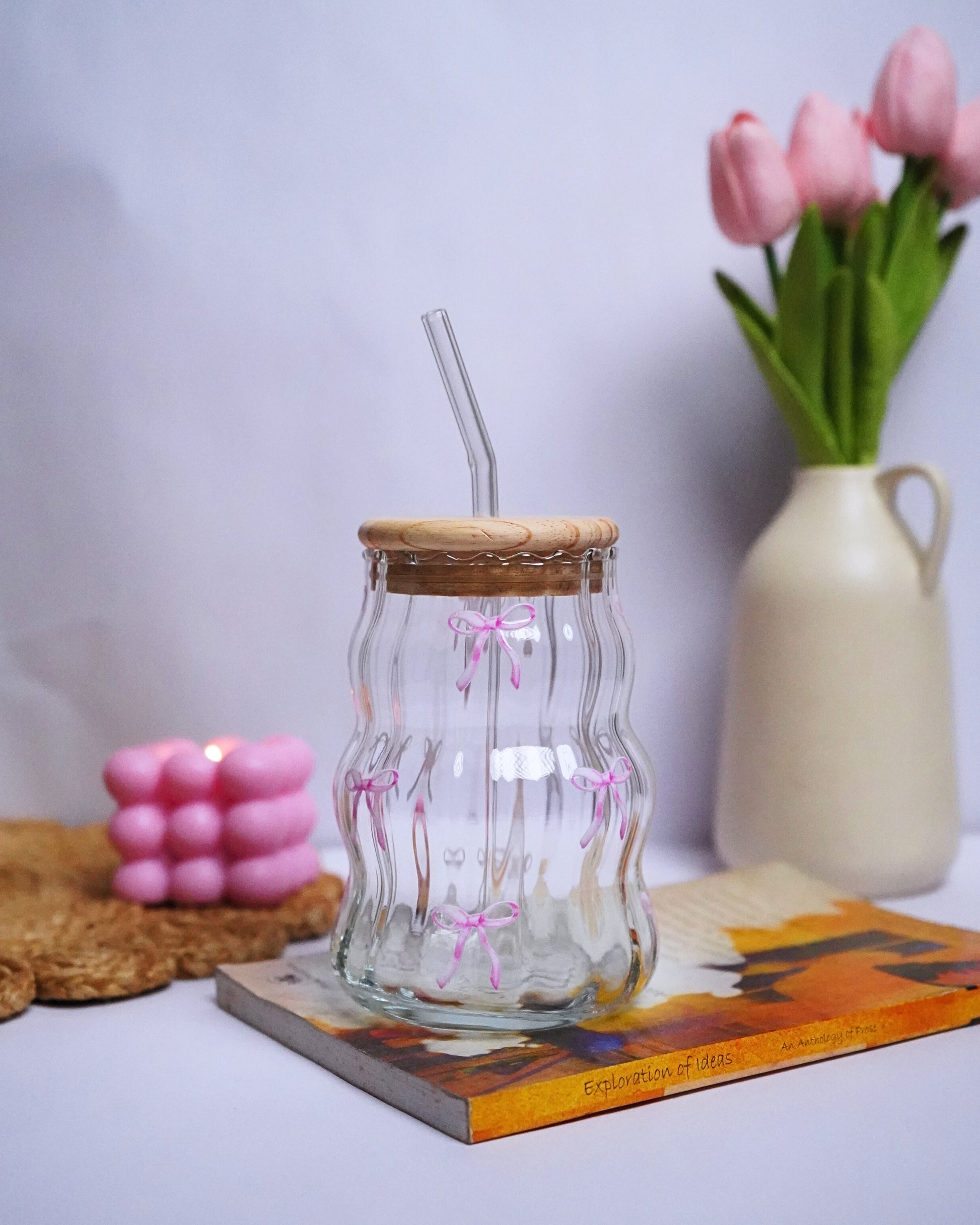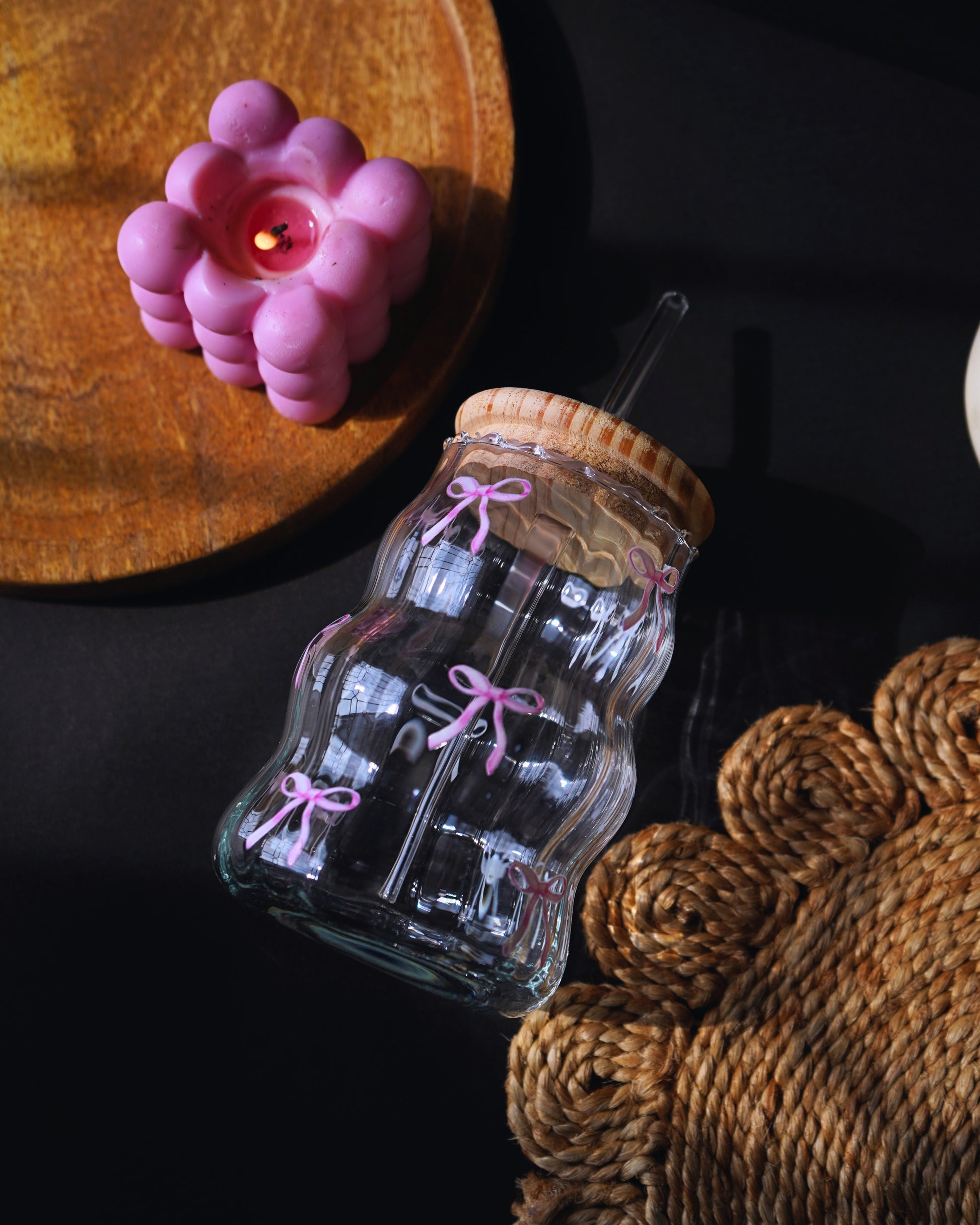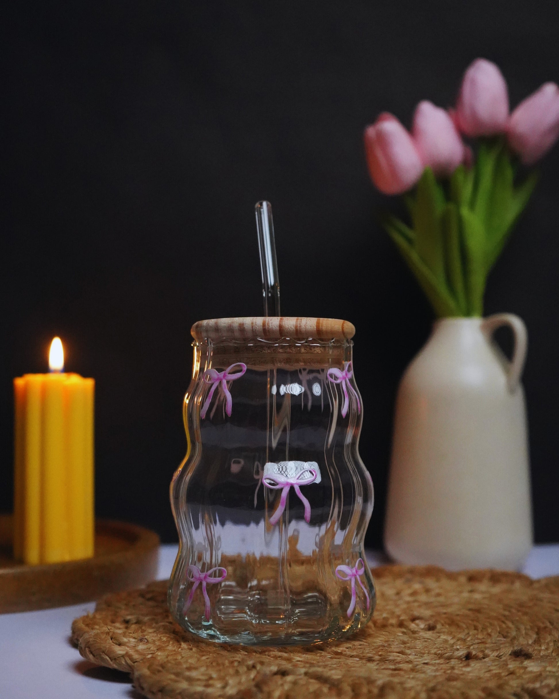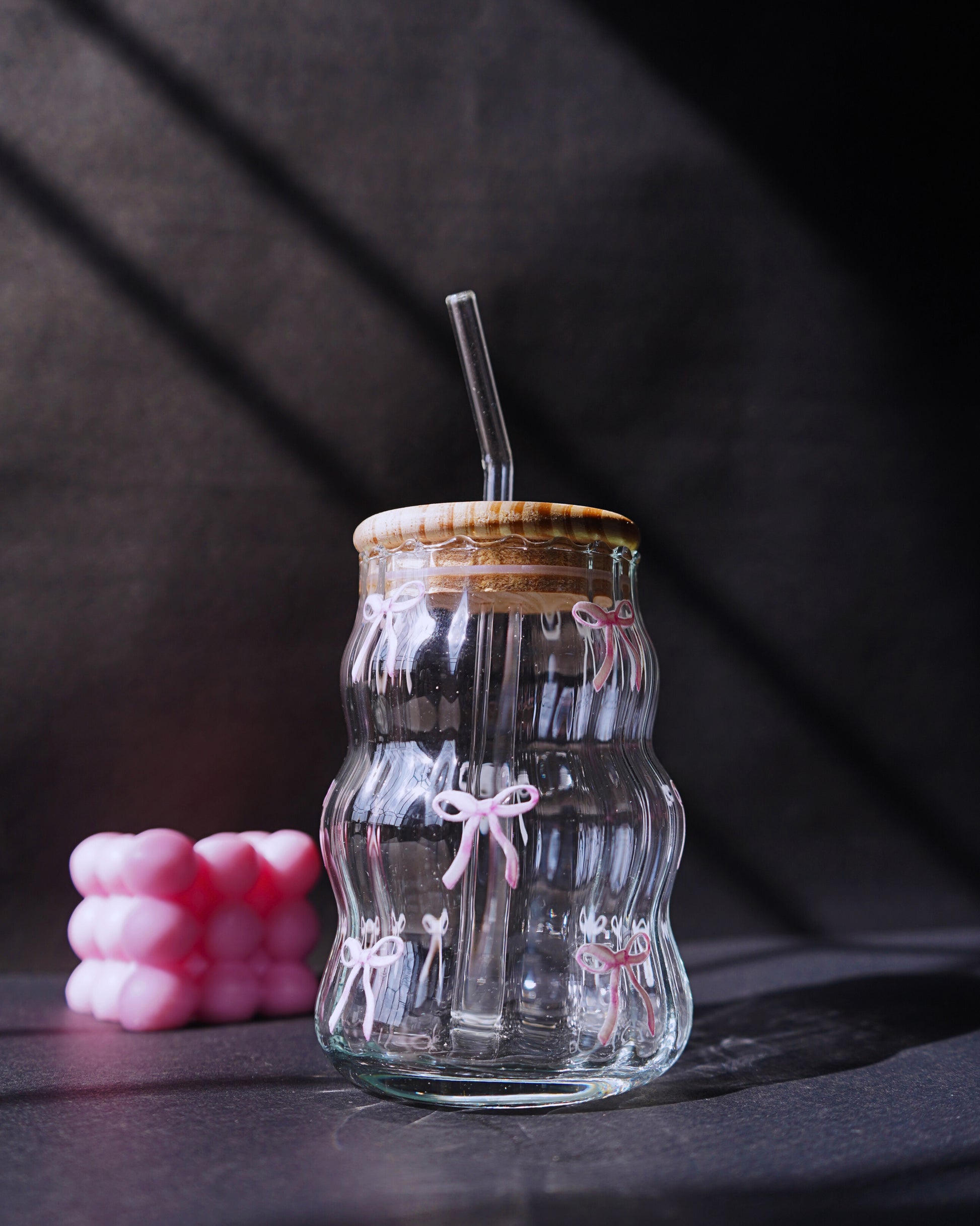 Meet Blushie — your new fav glass tumbler that’s equal parts soft girl charm and subtle slay. featuring dainty pink bows on clear glass, she’s giving picnic dates, love letters, and main character energy with every sip.