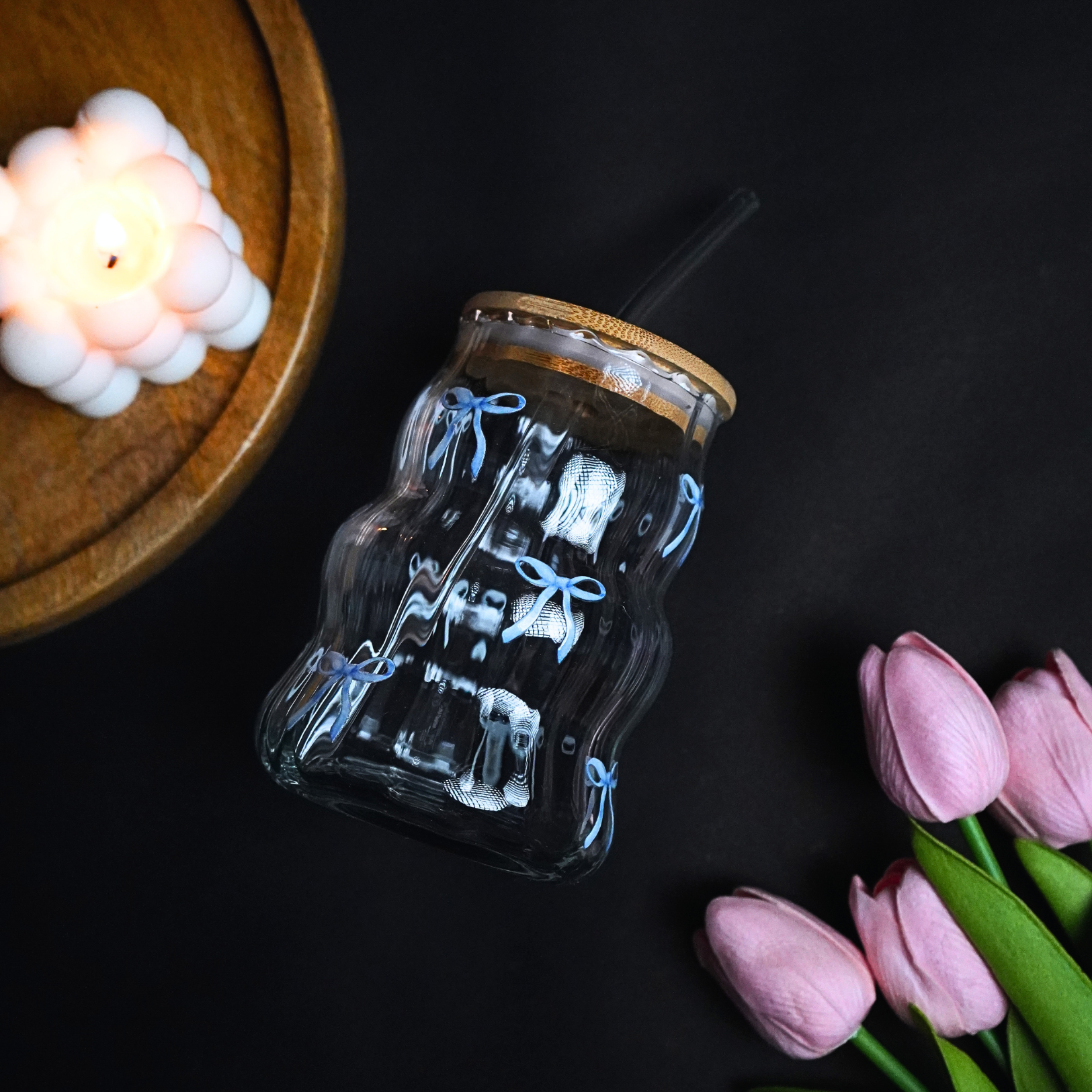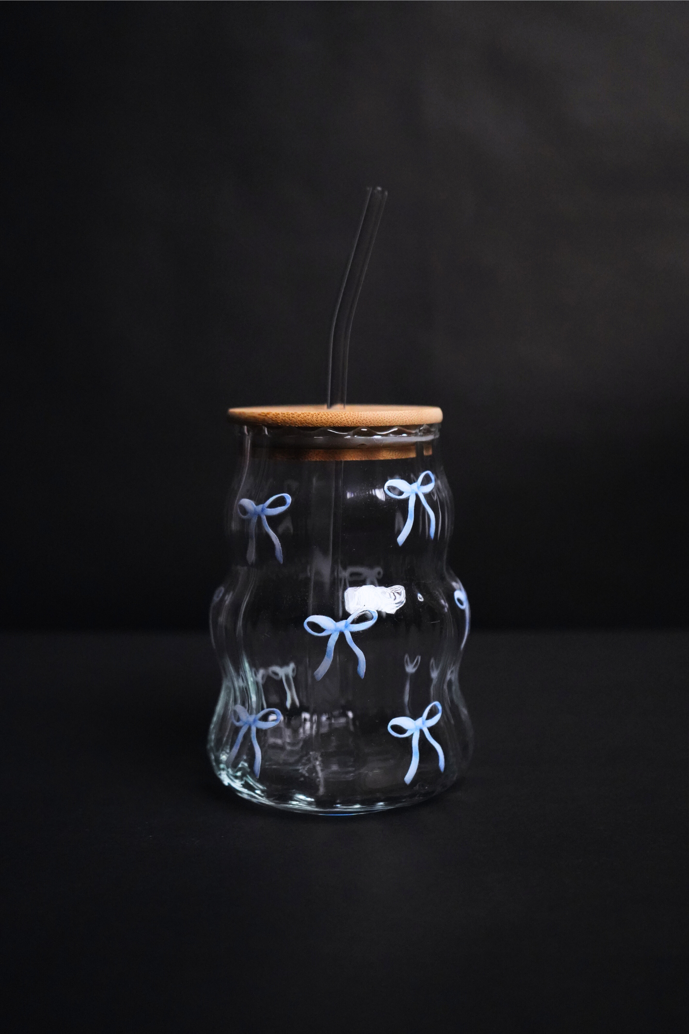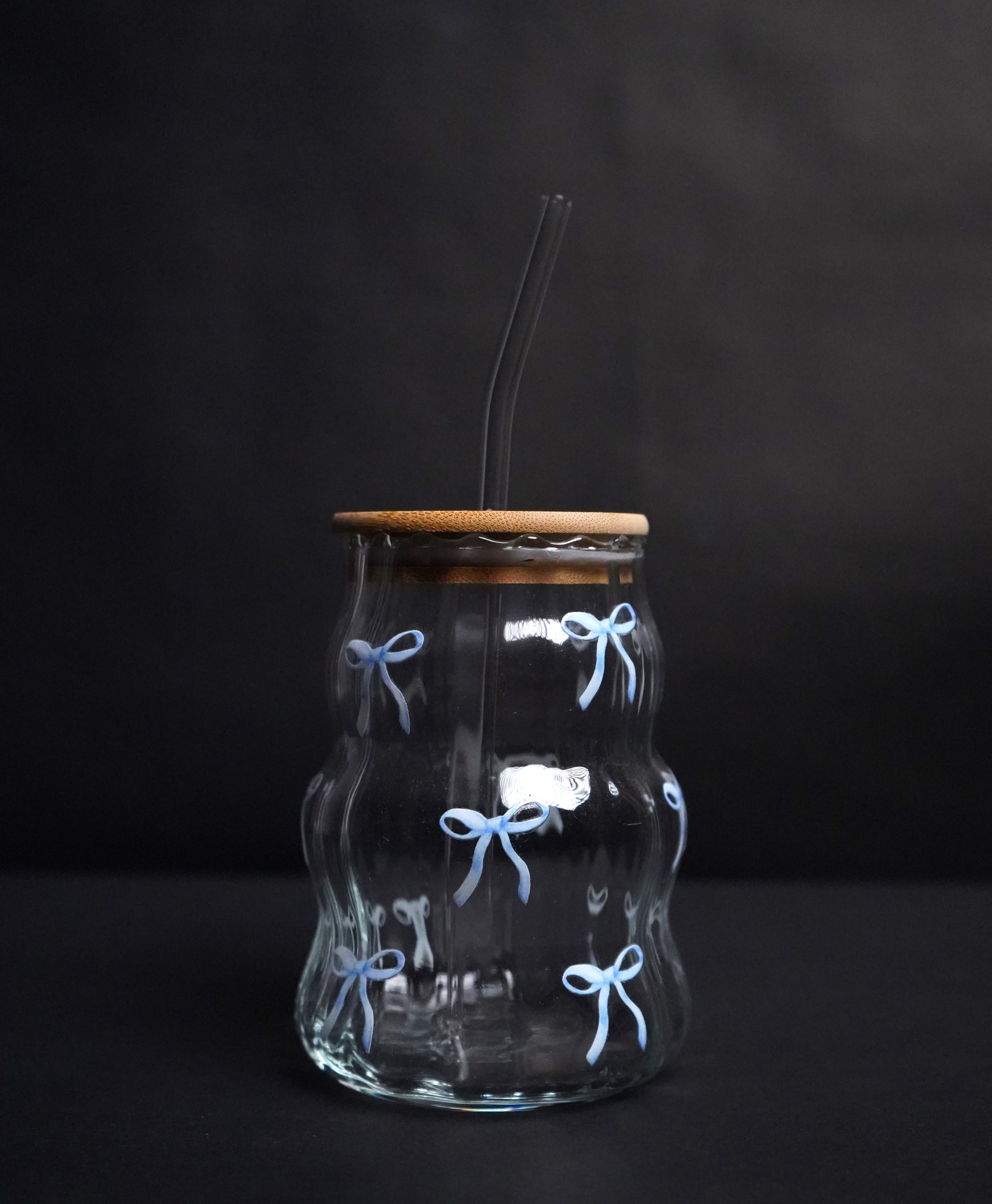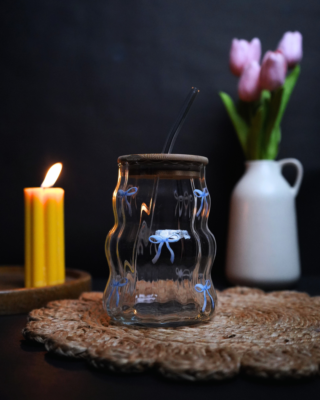 Meet Blue Blushie — your new fav glass tumbler that’s equal parts soft girl charm and subtle slay. featuring dainty pink bows on clear glass, she’s giving picnic dates, love letters, and main character energy with every sip.